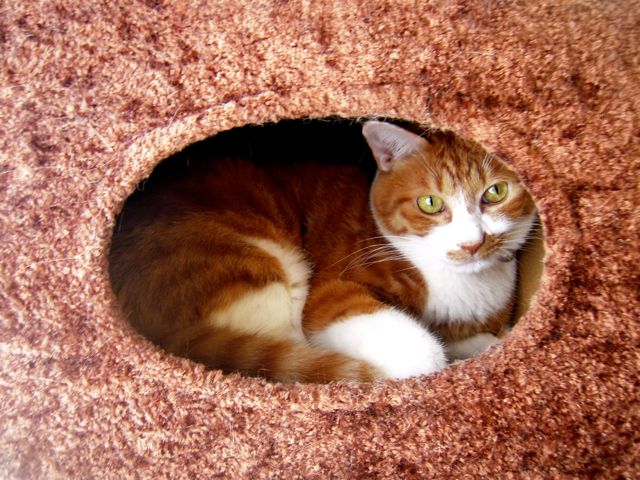キャットタワーの箱の中にちんまり落ち着いて、なに考えているんだか。