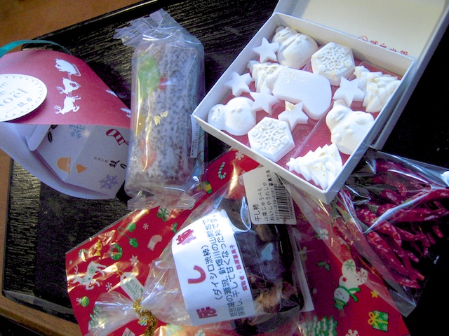 キラキラ光るワイヤー入りのリボンがあったので、それを蝶結びの形にして大きなリボン飾りにしました。ちょっと緑があったほうがクリスマスらしいので、お菓子の箱に結わえてあった緑のリボンを結びました。
