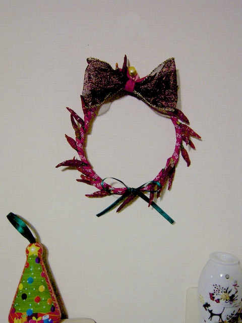 それだけでは弱いので、赤いリボンを探してきて柄で繋がって出来ている輪にグルグルと巻きつけていきました。