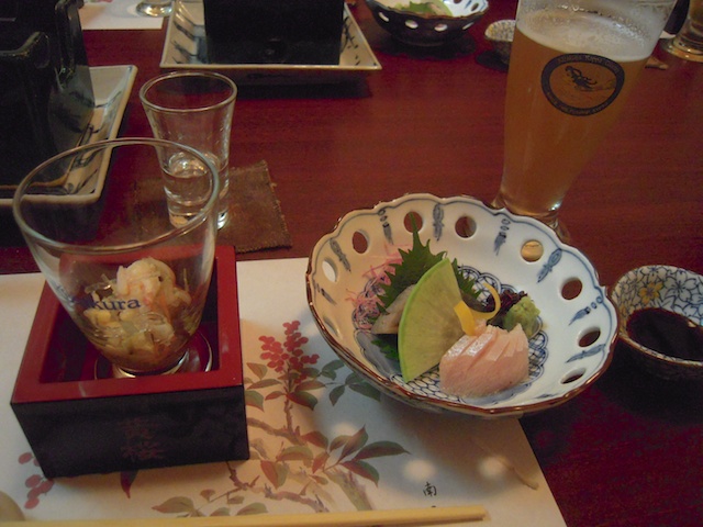 まず食前酒ではじまり、黄桜の地ビールで乾杯。お刺身が2種類。