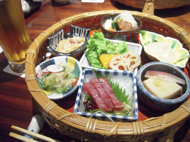 七品ほどの突き出しの一揃えと生ビール。