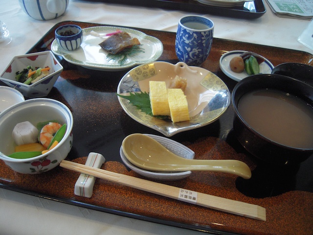 二日目の朝は橿原観光ホテルでの朝食でしたが、どうせホテルの朝食だからバイキングか、と思いきや、奈良の名物である茶粥をメインにした朝食。