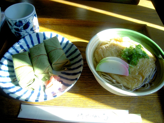 きつねうどんと柿の葉寿司のセットです。柿の葉寿司は奈良の郷土料理。柿の葉で包まれた中には鯖寿司が入っています。