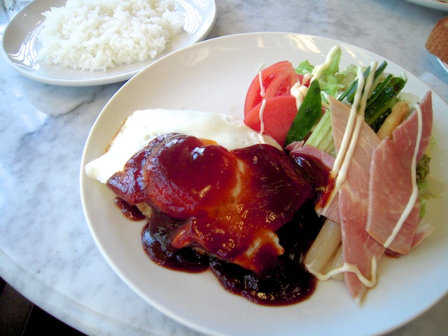 サンドイッチやスパゲティーも魅力的でしたがハンバーグにしました。目玉焼きが乗っていて濃いデミグラスソースがかかっている、どこか懐かしい喫茶店のハンバーグ。