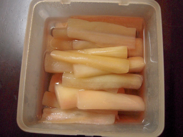 さっと湯がいたところで、沸かした甘酢に漬けました。色がピンクに変わりました。