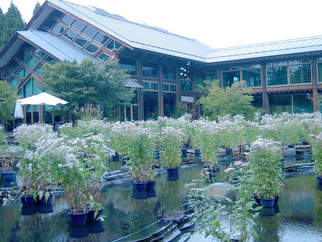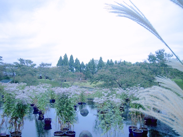 梅小路公園のフジバカマは地植えではなく植木鉢に植えられたものですが、鏡の池に並べられたフジバカマは美しい。